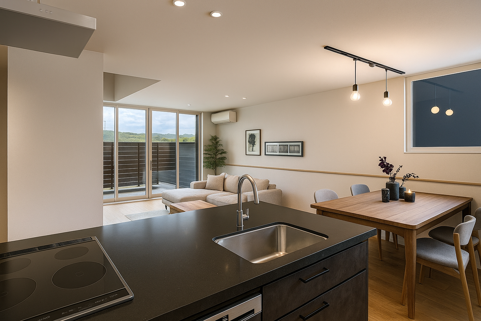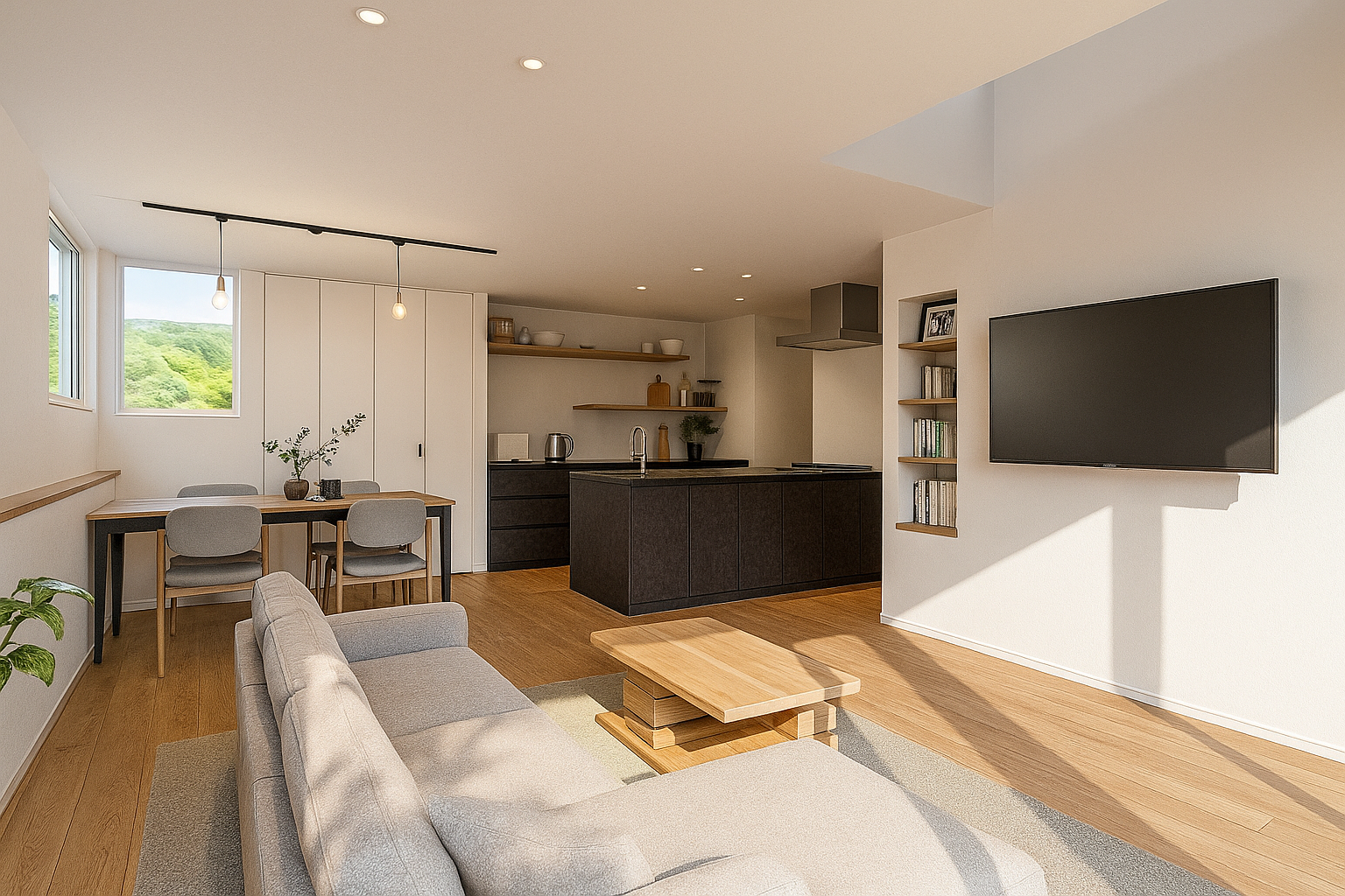 キッチンに立ちながら、ダイニングやリビング、外の景色まで見渡せる間取り。料理をしながら子どもの様子を見守ったり、自然と会話が生まれたり。家事をしながらもちゃんとつながっている安心感がある空間です。