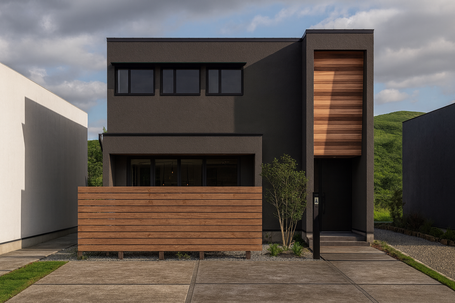 深みのあるダークトーンの外壁に、木のぬくもりを感じる天然素材を組み合わせ、上品で落ち着いた印象に仕上げました。